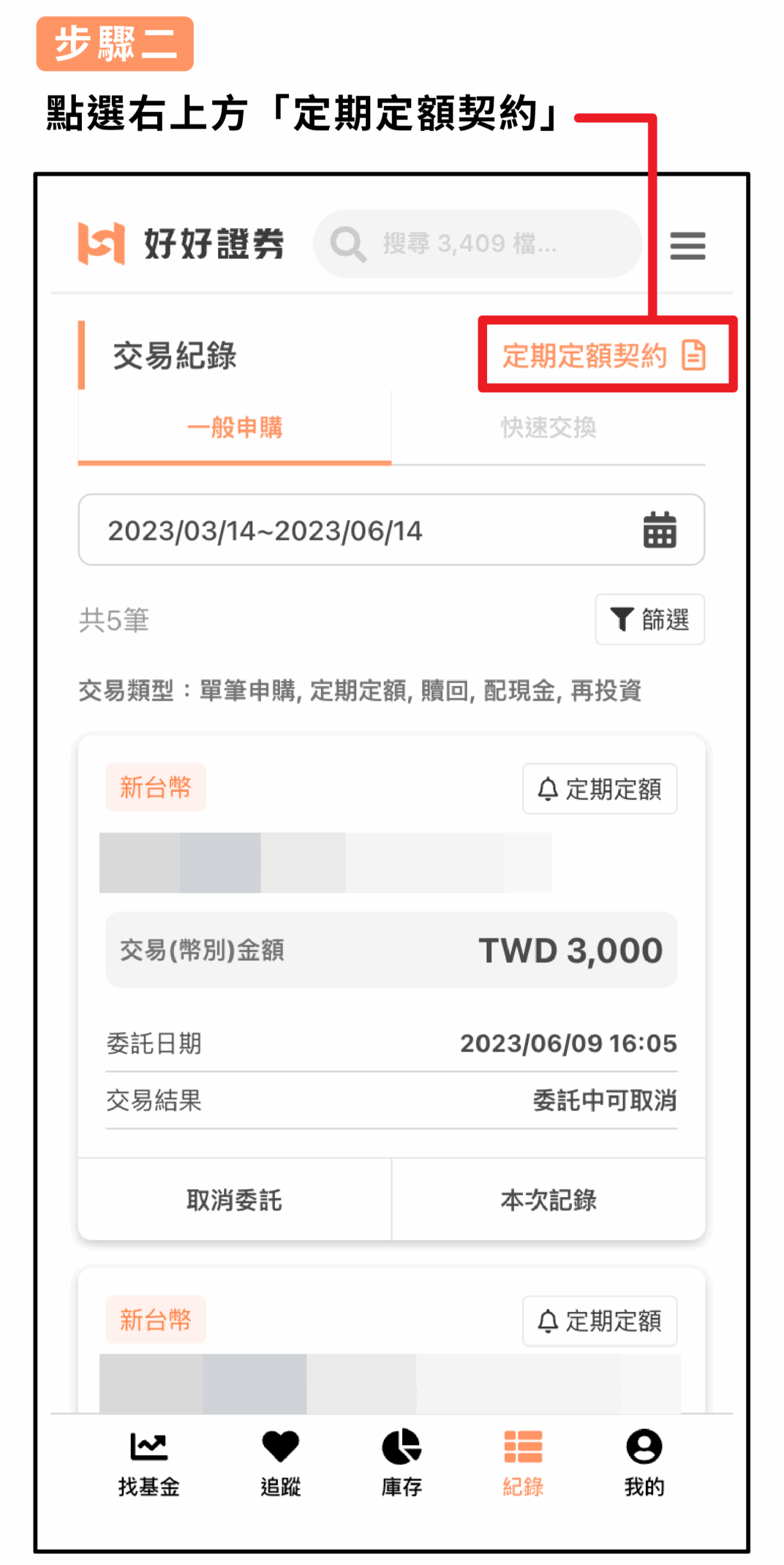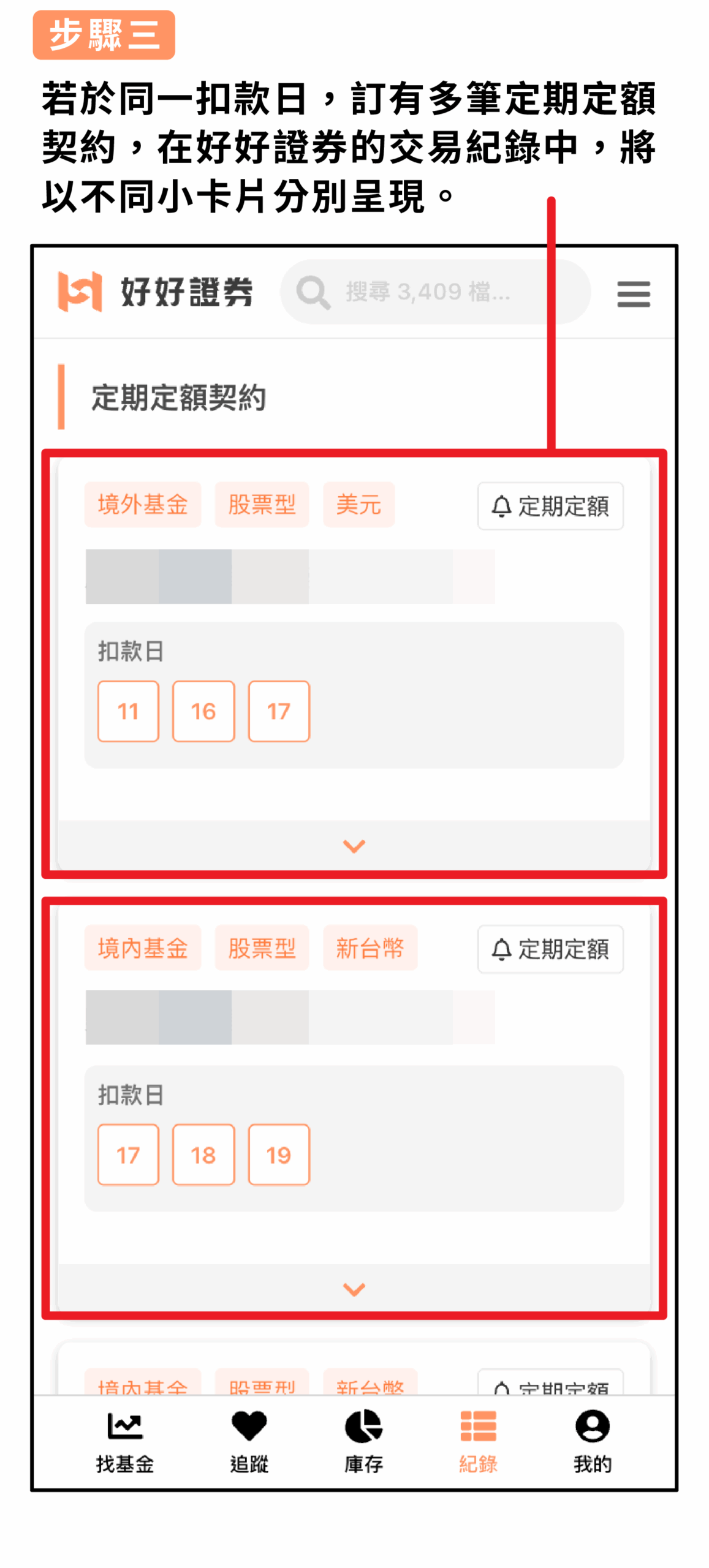 2.若於同一扣款日,有多筆定期定額契約,在好好證券的交易紀錄中,將以不同小卡片分別呈現。