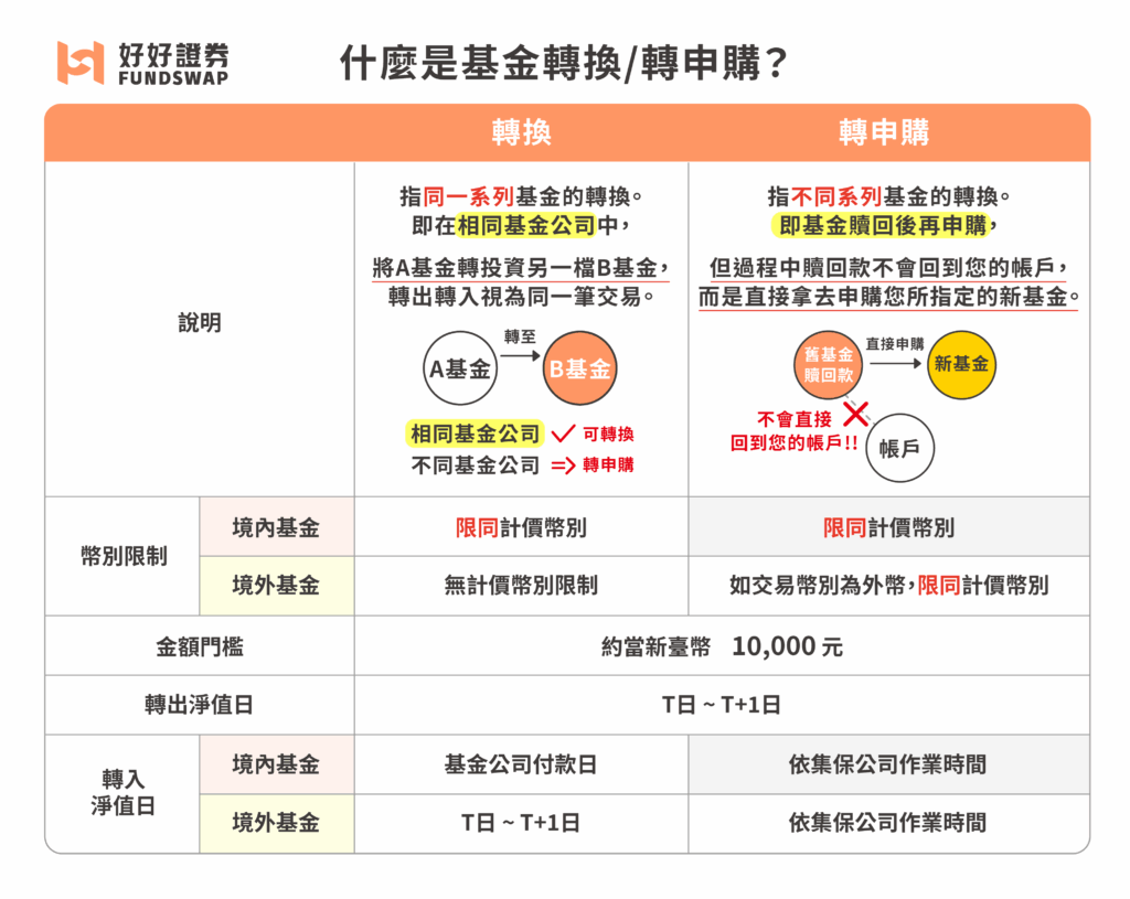 4.執行轉換或轉申購交易,如涉及不同幣別,將產生換匯價差費用(交易匯率以台灣集中保管結算所或基金公司提供為準),投資人應留意相關匯率風險與交易成本。