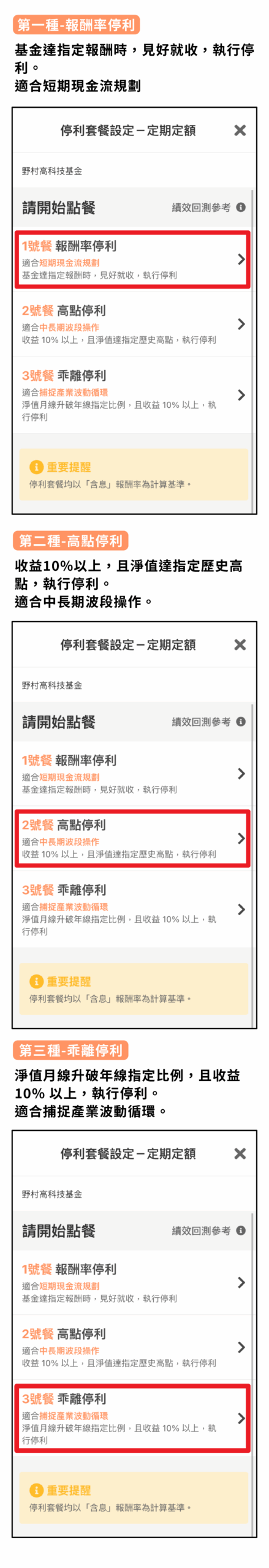 好好證券提供三種不同的停利方式,分別為報酬率停利、高點停利和乖離停利,投資人可以依據自身條件和目標,選擇適合自己的套餐。