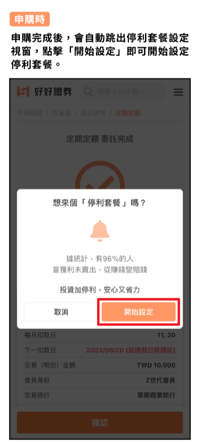 申購完成後,會自動跳出停利套餐設定視窗,點擊「開始設定」即可開始設定停利套餐。