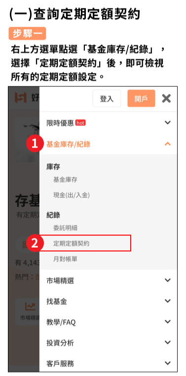 1.點選「基金庫存/紀錄」項下「紀錄」,選擇「定期定額契約」後,即可檢視所有的定期定額設定。
