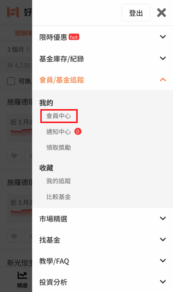 (1)手機版:點選右上方 ☰ →「會員/基金追蹤」