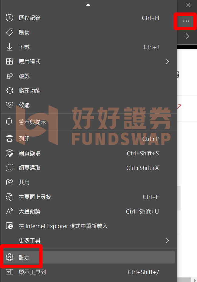 1.不論是 Edge 瀏覽器、Chrome 瀏覽器 都請在右上方 「˙˙˙」按鍵,並找到「設定」