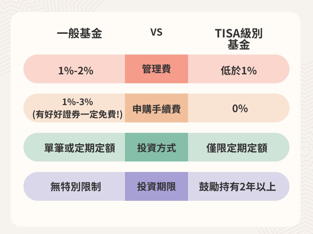- 投資成本低:TISA級別基金的兩大核心優惠為「申購手續費$0」與「經理費率低於1%(含)」 ( TISA 級別基金 ) 。